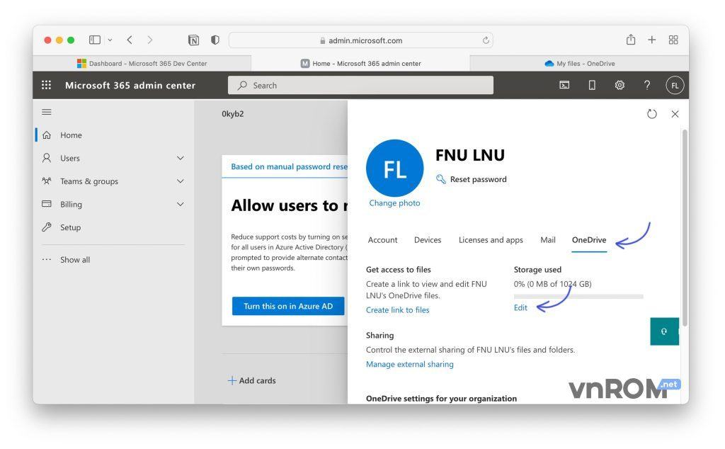 Bước 14: Vào OneDrive > tại mục “Storage used” chọn “Edit