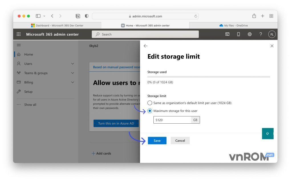Bước 12: Tại mục “User management” mọi người có thể thêm user mới, nhưng mặc định tài khoản mới tạo chỉ có 1TB lưu chữ OneDrive. Để có 5TB ta làm như sau: